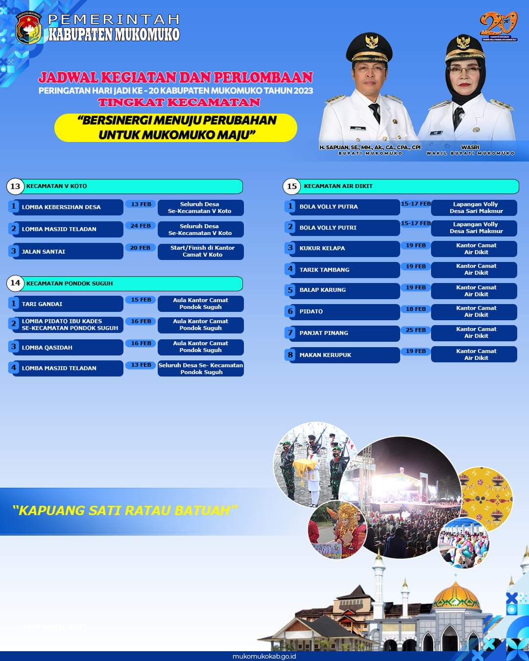 MukomukoSejumlah kecamatan di Kabupaten Mukomuko melakukan berbagai upaya agar mendapatkan dukungan dana untuk melaksanakan acara dalam rangka memperingati HUT Kabupaten Mukomuko ke-20 seperti salah satunya meminta sumbangan kepada pihak ketiga.